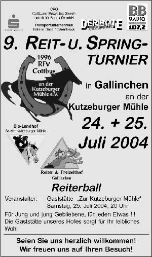haben können. In unserem Verein liegt der Schwerpunkt vor allem in einer vielseitigen Ausbildung. Deshalb legen wir Wert darauf, daß der Reiter in der Lage ist, mit seinem Pferd sowohl eine Dressur als auch ein Springen sowie einen Geländeritt zu absolvieren. Für unsere jüngsten Teilnehmer steht ein Geländewettbewerb auf dem Programm. Auf einer Strecke von 800 Metern sind acht feste Geländehindemisse zu überwinden. Das werden vor allem Baumstämme und Hecken sein, auch ein Auf- und Absprung ist dabei. Beim Stilgeländeritt der Klasse E, der für alle Altersklassen ausgeschrieben ist und schon über eine Strecke von 1 500 Metern mit circa 15 Hindernissen führt, kommen dann auch noch zwei Gräben sowie ein Wasserhindernis hinzu. In diesem Wettbewerb wird die Zeit begrenzt sein. Bewertet wird das harmonische Zusammenwirken von Reiter und Pferd mit einer Wertnote von null bis zehn. Da wir in der Umgebung der einzige Verein sind, der Geländewettbewerbe durchführt, möchten wir Sie am 24. Juli einladen, bei diesem spannenden Sport live dabei zu sein. Katja Kassin |