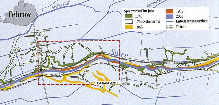 Spree im Laufe der Jahrhunderte: Blau zeigt den Stand von 2000,