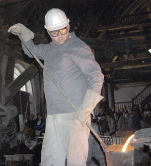 Mitarbeiter vom Baumarkt Strödel Aluminium gießen.