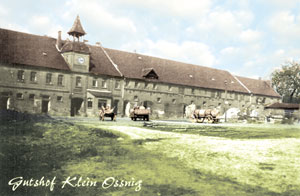 Aufnahme des Gutshofes Klein Oßnig mit Turm und Uhr. Das