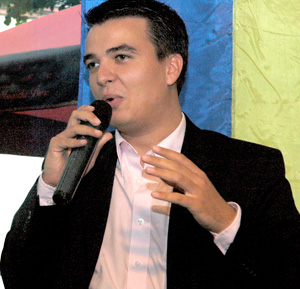 Vor der ukrainischen Fahne im Doppeldeck: Denis Kettlitz von den
