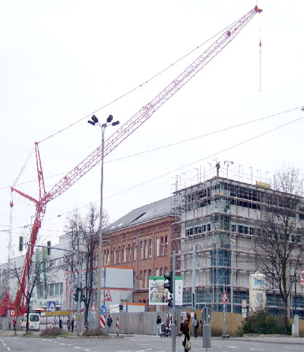 der Mobilkran das Dach am ersten Bauabschnitt des Carl-Blechen-Carrés