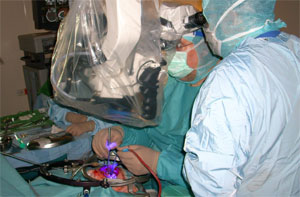 Chefarzt der Klinik, operiert unter dem Operations-Mikroskop mit