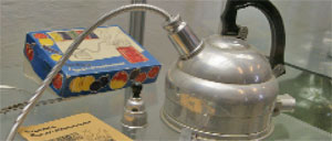 einfacher Pfeifkessel (unten) diente zur Dampfherstellung für