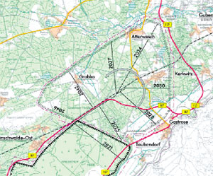 Streckenführung der Bahnstrecke Cottbus-Guben sowie der B97n.