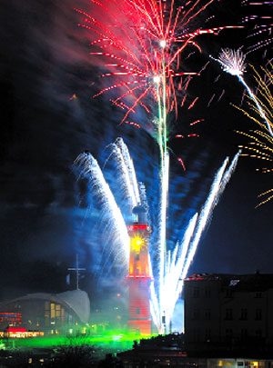 ein spektakuläres Feuerwerk wie an der Warnemünder Mole