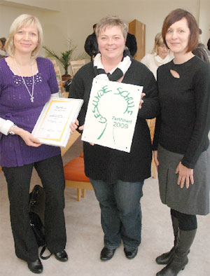 (re.), überreichten Urkunde und Plakette an Schulleiterin