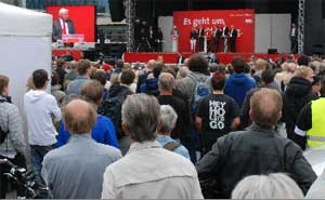 Frank-Walter Steinmeier vor der Stadthalle mit einem Übermaß