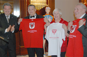 Satz Cottbus-T-Shirts mit und überreichte sie an Ralf Gründer,
