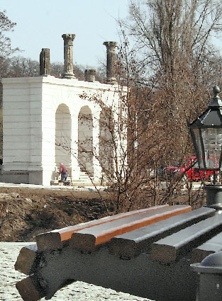 Das nachgebildete Eingangsportal des einstigen klassizistischenTheaters
