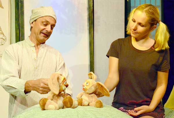 Hase und Fuchs als Puppen, die Kleinkinder als erwachsene Schauspieler