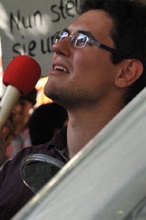 Schindler vom Studierendenrat hatte einen Spiegel dabei und wollte