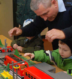 Enrico Ihrcke den Kindern an einem Verkehrsmodell, welches Häftlinge