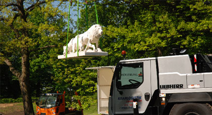 am Montag auf den Löwenbrunnen gehoben, der von der Firma