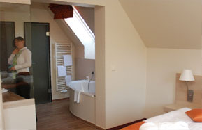 die Badewanne und der Waschtisch in das Zimmer integriert und