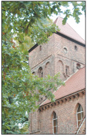 quer über die Wiese die Madlower Kirche (3) an, ein alter,