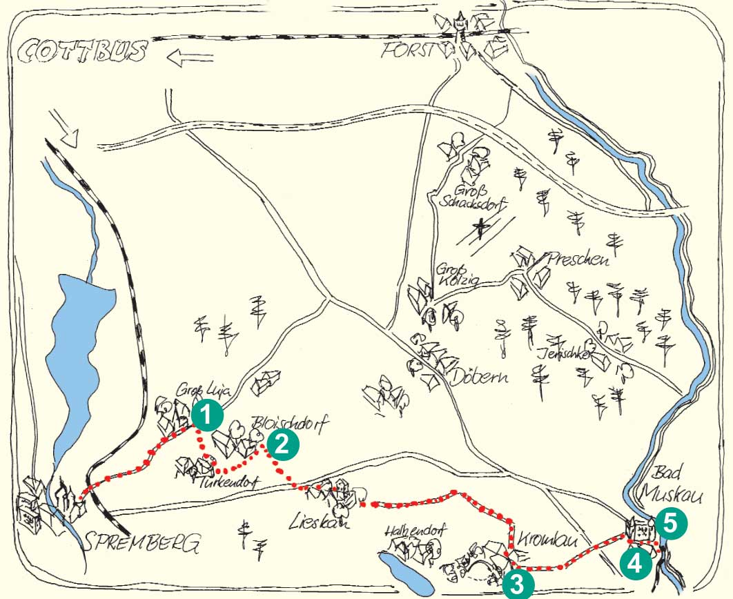 Wir müssen eine Anhöhe überqueren, um von da in froher Erwartung hinab zu rollen in das schöne Tal von Bad Muskau (4). Am alten Rathaus treffen wir auf die städtische Hauptstraße und finden gleich gegenüber einen hinteren Parkeingang.
