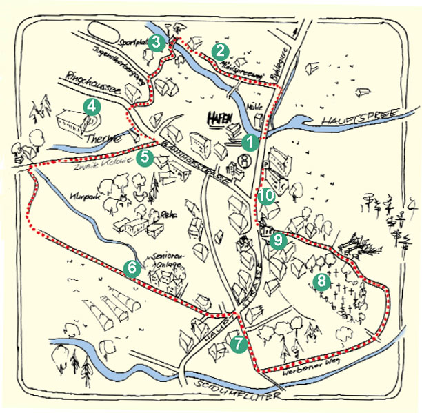 kleinen Werbener Weg und laufen dann im großen Bogen um