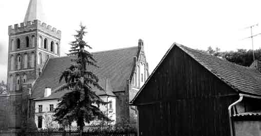 wirkt die alte Backsteinkirche in Papitz, die noch von alten Bauernscheunen