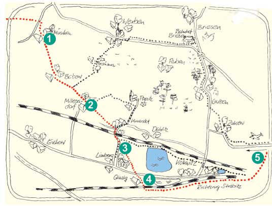 Auch von Leipe bleibt der Weg Richtung Burg zunächst schnurgerade, dann folgen wir kurz der Straße nach rechts und dem Wegweiser nach Naundorf. Durch Herbstidylle finden wir nach Müschen (1), weiter über Babow und Milkersdorf (2) nach Limberg (3). Hier ist jetzt etwas Mut gefragt, den Weg an der verfallenen Mühle geradeaus zu nehmen. Er ist nicht gut befahrbar, führt aber durch schönen Wald, die Bundesstraße überquerend, schließlich nach Glinzig (4).